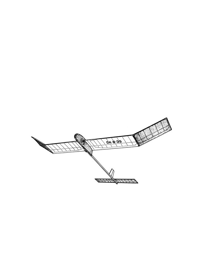 Křídlo. Smrkové lišty náběžné hrany a hlavního a pomocného nosníku s rovnými, hustými léty, bez suků, obrousíme ze všech stran brusným papírem nalepeným na prkénko. Pak na lištu hlavního nosníku K1 přilepíme zesílení střední části K2. Odtokovou lištu K3 z tvrdší balzy tl. 3, nejlépe zrcadélkového řezu, uřízneme balzořízem a hoblíkem Narex ji ohoblujeme do trojúhelníkového průřezu; dbáme na to, aby průřez byl po celé délce lišty shodný. Do přebroušené odtokové lišty vypilujeme plochým jehlovým pilníkem zářezy pro žebra.