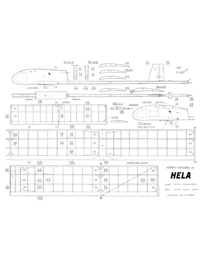 Stavebních plánů jednoduchých modelů kategorie A1 je stále nedostatek. Pro členy kroužku v ODPM Mladá Boleslav jsem proto navrhl model Hela. Profil jeho křídla odpovídá překližkovým žebrům vyráběným v LMK Liberec, jež je možné při stavbě po malé úpravě zářezů pro lišty použít. Pokročilejší modeláři mohou stavět verzi s děleným křídlem, jehož poloviny se nasouvají na spojovací dráty. Začátečníkům, kteří však už postavili alespoň větroň kategorie A3, je určena verze s křídlem vcelku, u níž odpadá pracné vyřezávání kořenových žeber z překližky. Díky pružnému připojení křídla k trupu vázací gumou vydrží model nešetrné zacházení. Na pionýrských táborech mladých techniků pořádaných ODPM Mladá Boleslav bylo postaveno mnoho exemplářů Hely a létaly velmi dobře. Po několik let s ní dosahují mladoboleslavští žáci výborných výsledků při soutěžích STTP v rámci okresu i kraje a zajišťují si postup na přebor ČSR. V našem klubu s ní létá soutěžně i řada juniorů a seniorů.