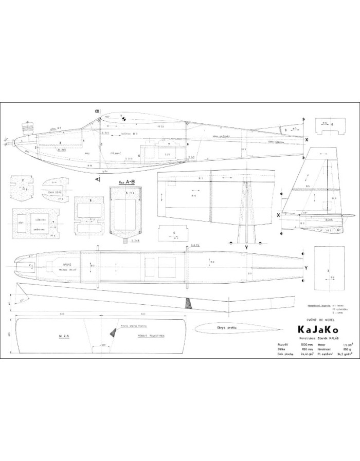Výkres je ve skutečné velikosti kromě křídla, které je v měřítku 2 : 5 a okótováno, aby bylo možné i bez proměřování zhotovit všechny části. Všechny rozměry jsou v milimetrech.